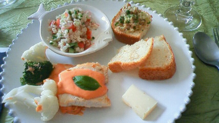 メニューは押し麦のサラダ、カジキのソテー、鶏と長葱のブルスケッタ、マロンパイ♪